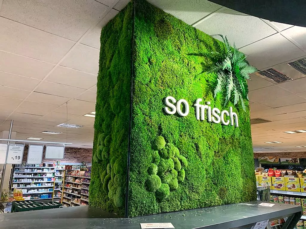 Auf Wunsch erweitern wir Ihre Mooswand um Beleuchtung, Markenfarben oder CI-konforme Formen – für ein Design, das Ihre Markenidentität sichtbar macht.